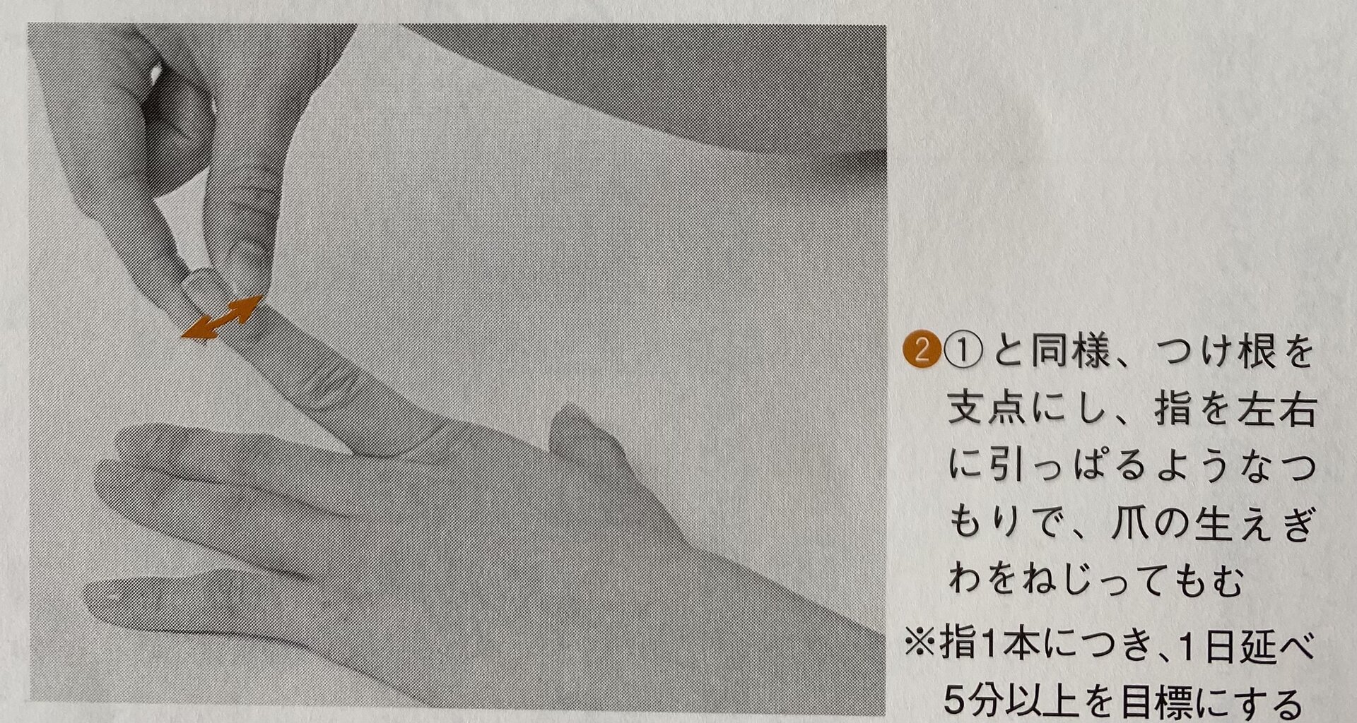 ・爪の生え際を捻りながらもむ。心地の良い痛み程度の刺激量で。関節が硬いと指はあまり動かないが続けると動きも大きくなり、気の通りもよくなる。
